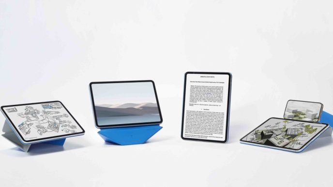 Le Dynamic Folio est conçu avec une structure inspirée de l’origami, permettant plus de 20 orientations différentes pour une utilisation ergonomique. Il est ultra-fin et léger, et comprend un support pour Apple Pencil, un mode flottant pour améliorer la posture, et un support pour téléphone.