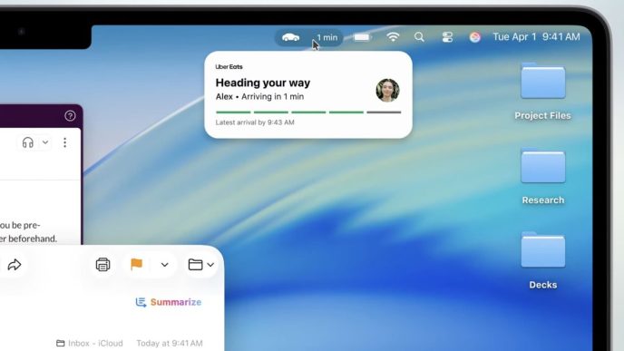 Sur macOS Tahoe, les Live Activities issues de l’iPhone s’affichent directement dans la barre de menu, permettant aux utilisateurs de suivre facilement les mises à jour sans avoir à vérifier leur téléphone, améliorant ainsi la continuité entre les appareils.