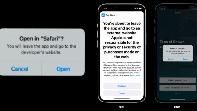 Apple peut exiger une alerte intermédiaire pour prévenir les utilisateurs qu’ils naviguent vers un site tiers, mais cette alerte doit être simple et non intrusive, contrairement à l’ancien modèle de modal plein écran.